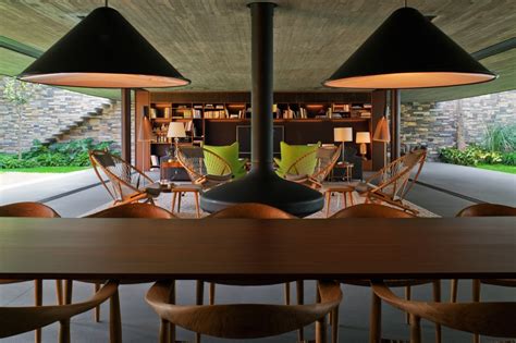 The V 4 House By Studio Mk 27. The low bunker-style home is a bold mix of tropical furnishings with ultra-modern architecture. The sprawling ground-floor house has a slab roof supported by a series of columns.